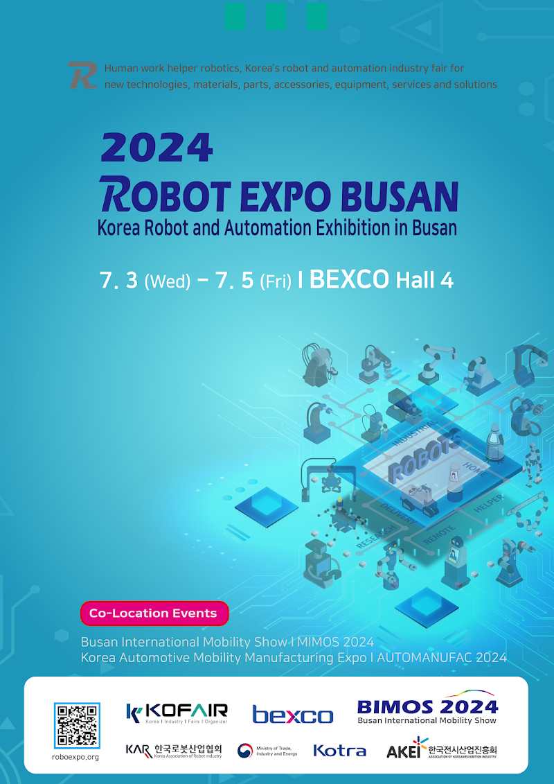 Held concurrently with the Busan Mobility Show, AutoManufacture Busan, and Korea Camping Car Show, the expo will showcase a variety of robots and components such as motors, reducers, controllers, semiconductors, batteries, charging devices, and the latest smart technologies and software including AI, ICT, and IoT systems.